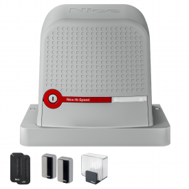 Kit-ul contine 1 motor Nice RBS600HS cu unitate de comanda si receptor incorporat, 2 telecomenzi, set de fotocelule si lampa de semnalizare.